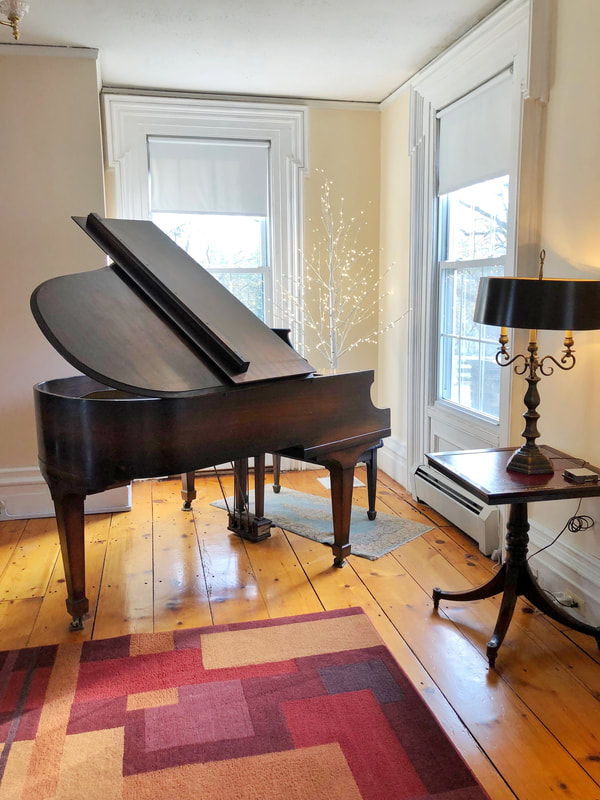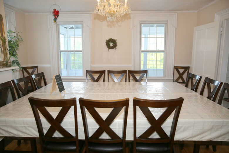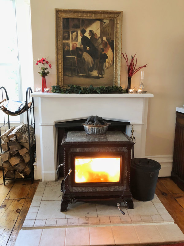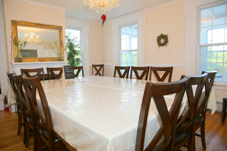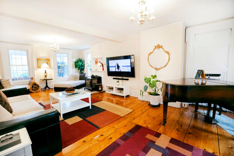 Guests, gatherings, and groups alike love our grand living room. Sun-streaked and bright during the day, cozy and intimate at night, the living room is a perfect blend of old-world charm and high-tech sophistication. The wide-board pine wood floors & ornate handmade moldings are over 160 years old. There’s a wood-burning stove for warmth and ambiance, as well as a 100-year-old baby grand piano for live music. A large TV, tons of premium channels for the latest movies or sports, an Xbox, and more.