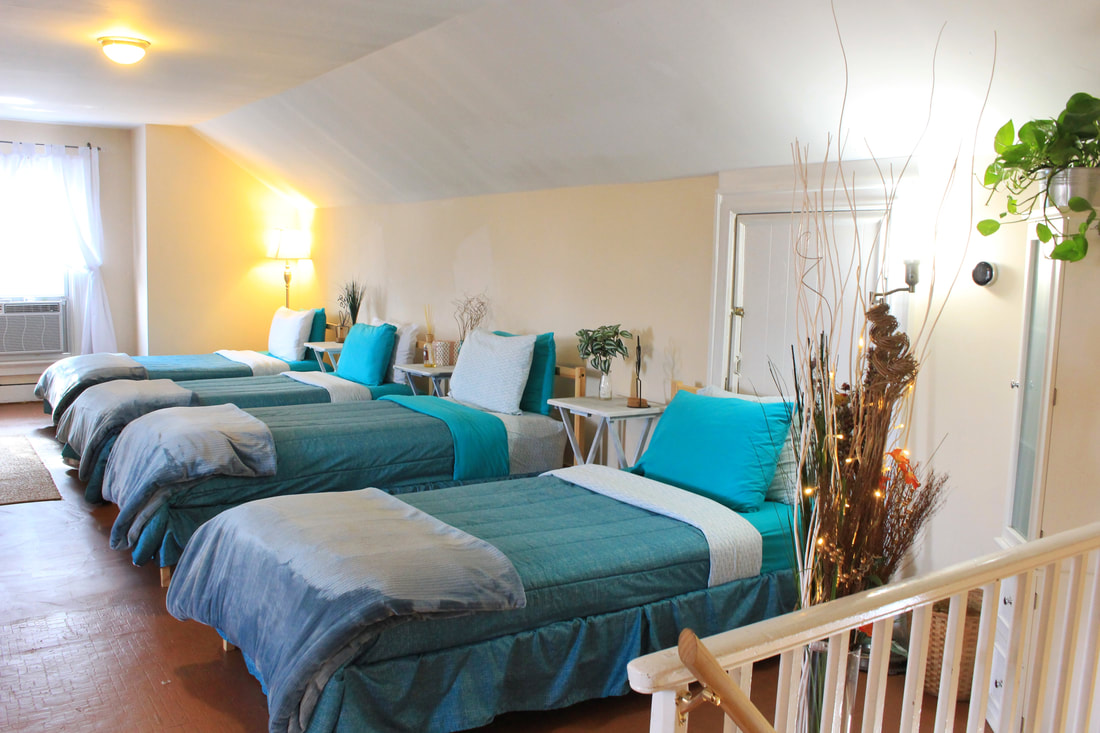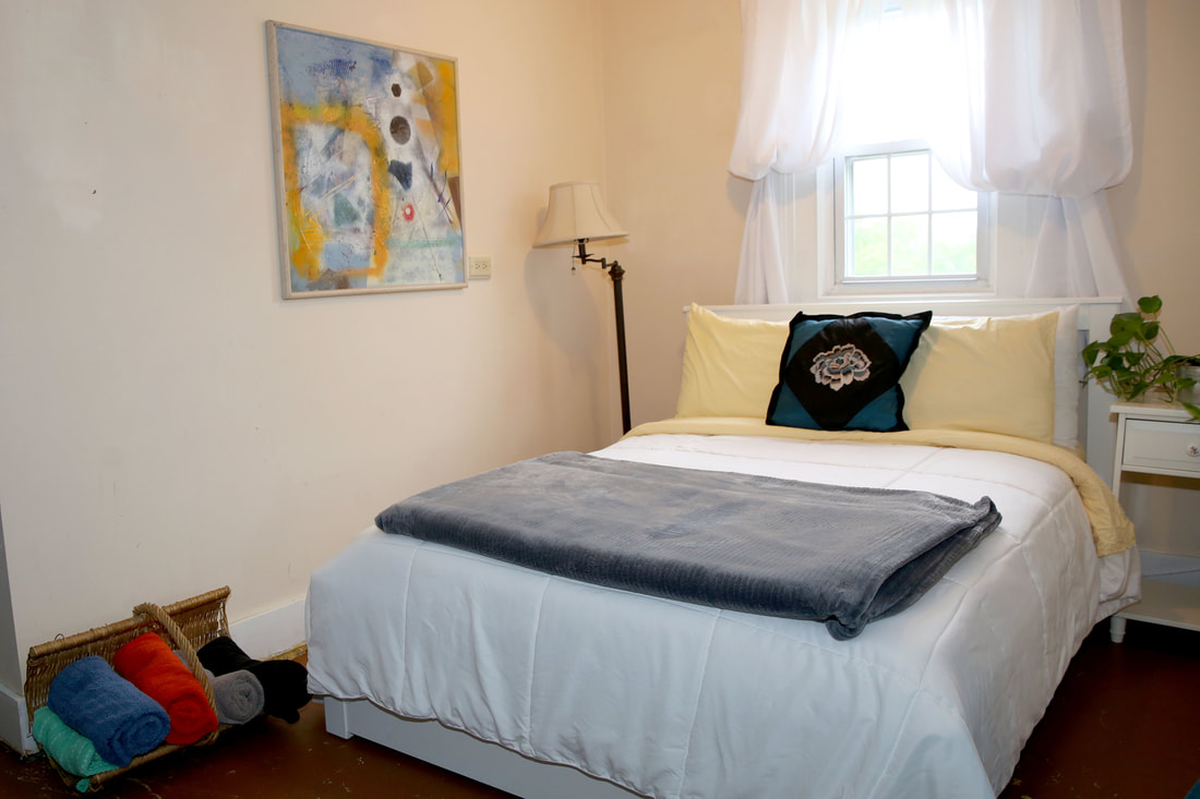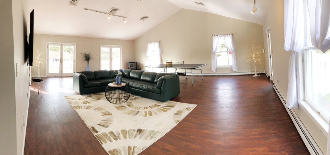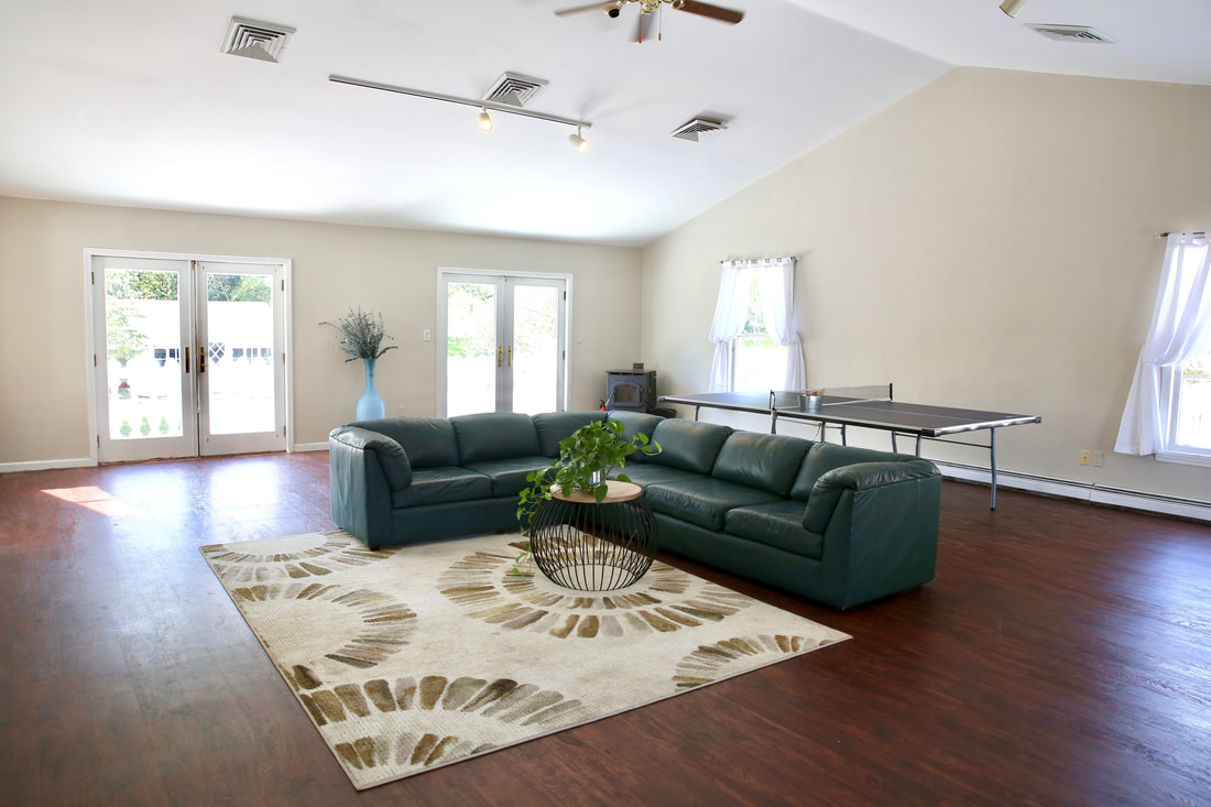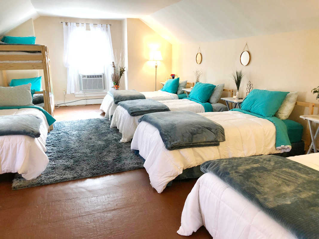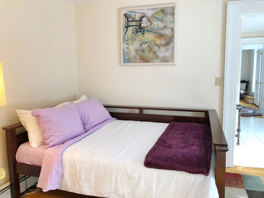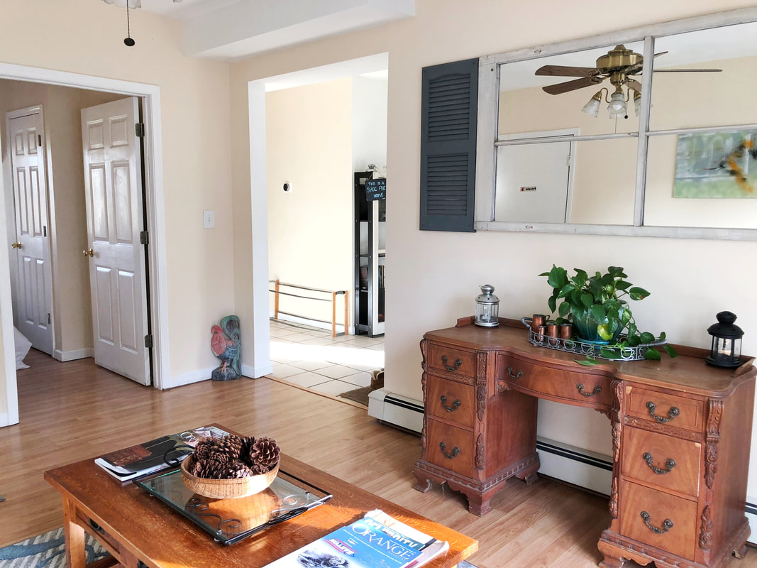 Guests, gatherings, and groups alike love our grand living room. Sun-streaked and bright during the day, cozy and intimate at night, the living room is a perfect blend of old-world and high-tech. The wide-board pine wood floors & ornate handmade moldings are over 160 years old. There’s a wood-burning stove for warmth and ambiance, and a 100-year-old baby grand piano for live music. A large TV, tons of premium channels for the latest movies or sports, an Xbox, and more.