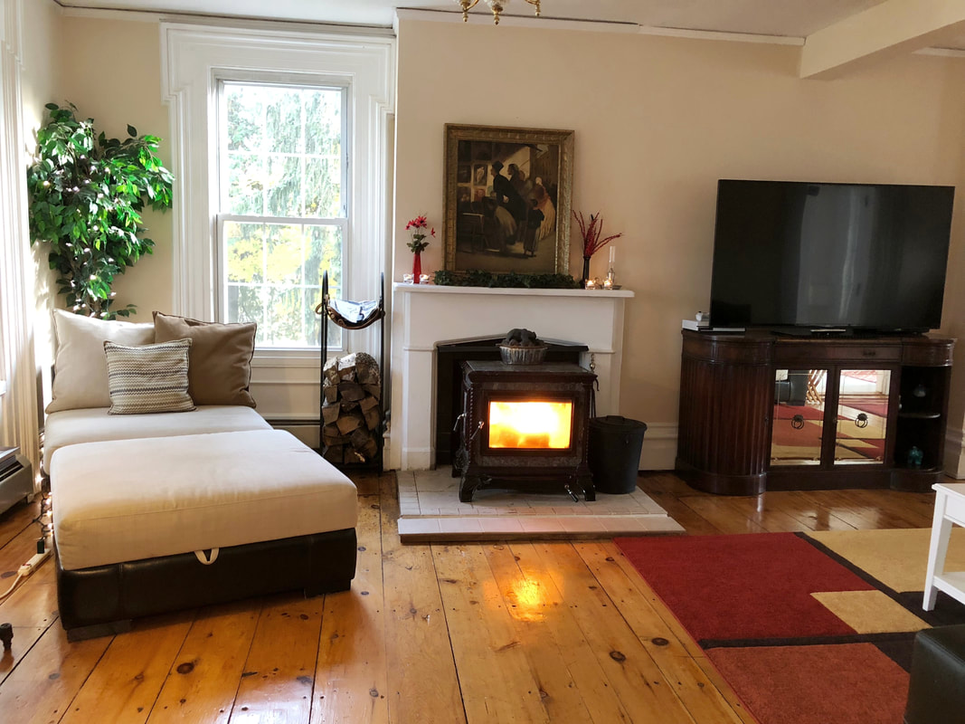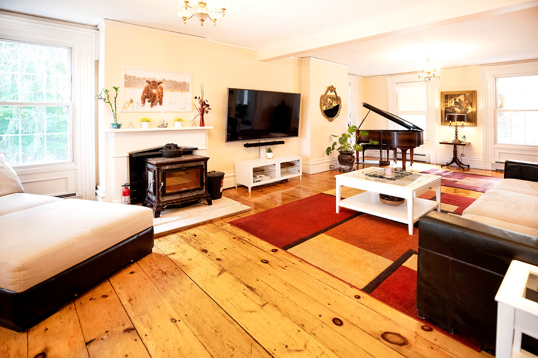 Guests, gatherings, and groups alike love our grand living room. Sun-streaked and bright during the day, cozy and intimate at night, the living room is a perfect blend of old-world charm and high-tech sophistication. The wide-board pine wood floors & ornate handmade moldings are over 160 years old. There’s a wood-burning stove for warmth and ambiance, as well as a 100-year-old baby grand piano for live music. A large TV, tons of premium channels for the latest movies or sports, an Xbox, and more.